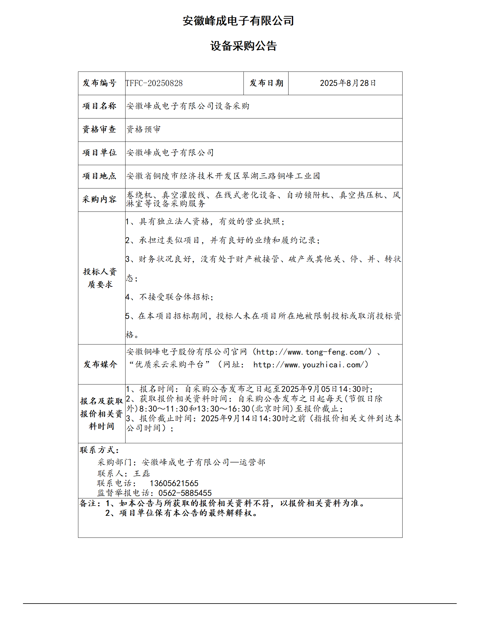 安徽峰成電子有限公司設(shè)備采購公告_01